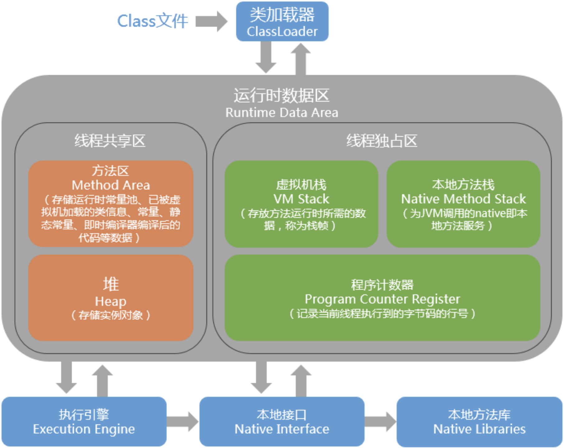 一个 Java 程序,首先经过 javac 编译成 .class 文件,然后 JVM 将其加载到方法区,执行 引擎将会执行这些字节码。 执行时,会翻译成操作系统相关的函数。JVM 作为 .class 文件的翻译 存在,输入字节码,调用操作系统函数。